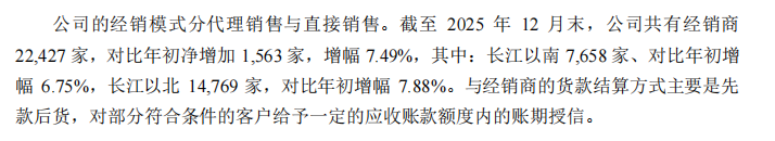 截至2025年12月末,公司共有经销商22,427家,对比年初净增加1,563家,增幅7.49%,其中:长江以南7,658家、对比年初增幅6.75%,长江以北14,769家,对比年初增幅7.88%。
