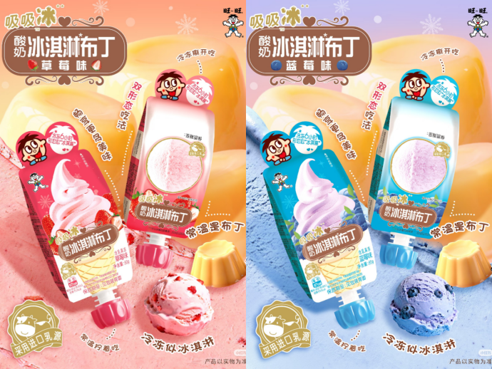 同样去年旺旺推出酸奶冰淇淋布丁新品,包括草莓味和蓝莓味两种口味。据官方介绍,新品均采用进口乳源,该新品拥有两种形态吃法,常温拧着吃,或冷冻撕开吃,冷冻6小时形态似冰淇淋,口感绵密。