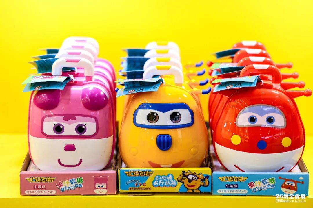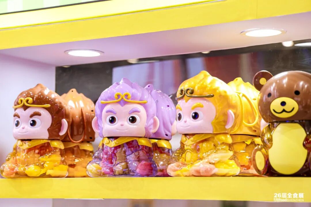 阿麦斯与迪士尼《玩具总动员》深度合作,将胡迪、翠丝等经典角色融入剥皮软糖的包装与造型中,打造出极具收藏价值的零食产品;广东金旺国际动漫则携超级飞侠、海绵宝宝等热门IP亮相,专注卡通儿童食品赛道21年,用熟悉的角色唤醒消费者的情感共鸣。